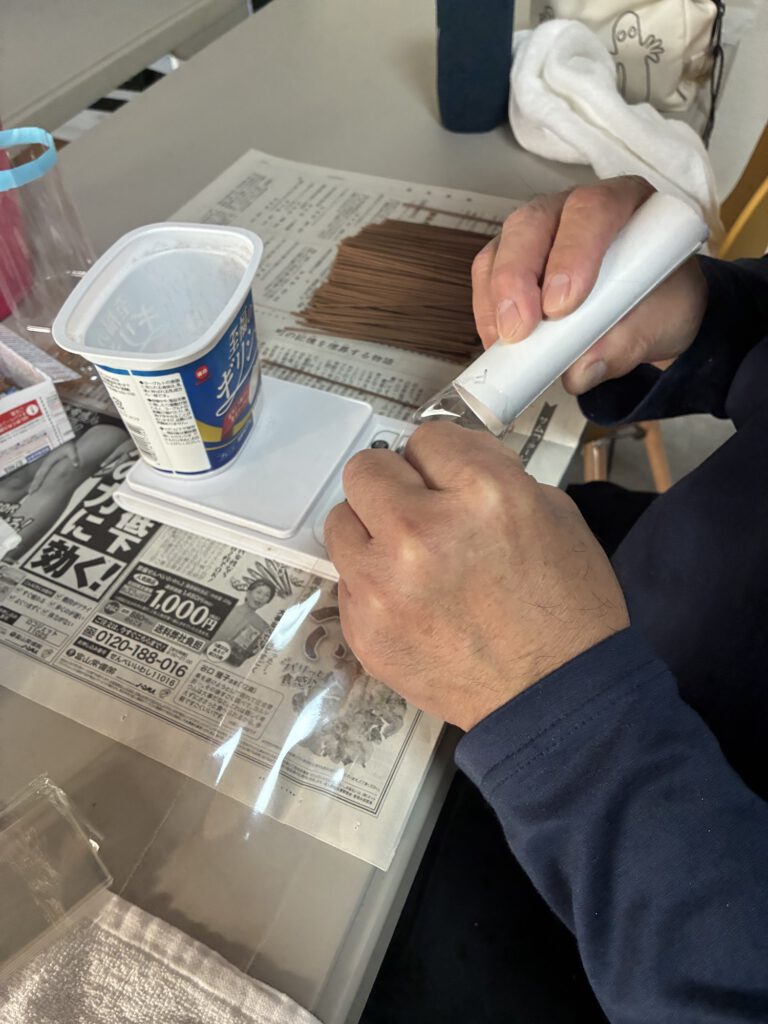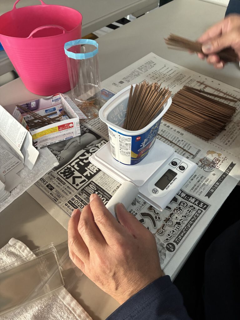 ①お線香を透明のフィルムケースに入れる準備をしているところです。